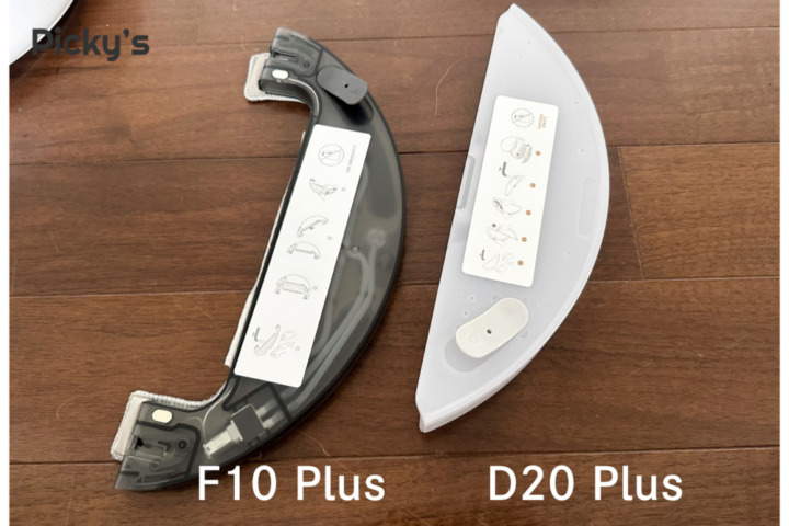 細かな違いとしては、F10 Plusはややツヤのある質感、D20 Plusはサラッとしたマット寄りの質感。また、裏面構造やモップサイズ、水タンク容量などに若干の違いがありますが、ぱっと見で大きな差を感じるほどではありません。