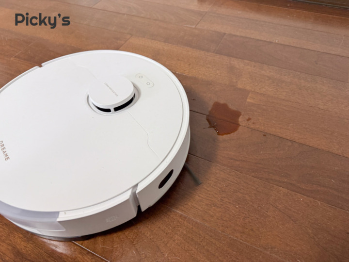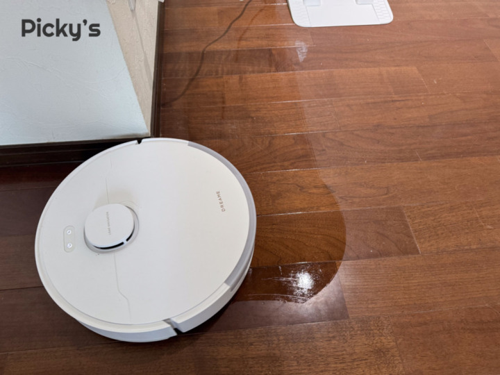 ポン酢などの液体汚れで検証したところ、一度の走行で完全に落としきるというよりは、複数回往復しながら徐々にきれいにしていく印象でした。なお、モップは自動洗浄ではなく手洗い式のため、汚れが強い場合は軽く拭き取ってから使用するほうが安心です。