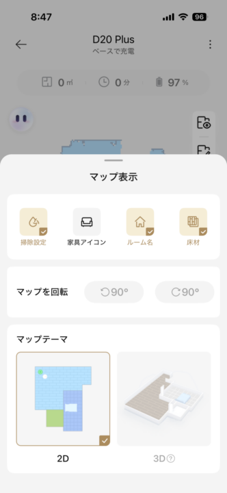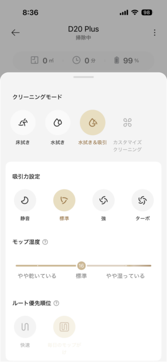 アプリでは、吸引モードや水拭きモード、湿度調整、清掃エリアの指定などを細かく設定できます。マッピング精度も高く、部屋の形状は正確に認識できていました。