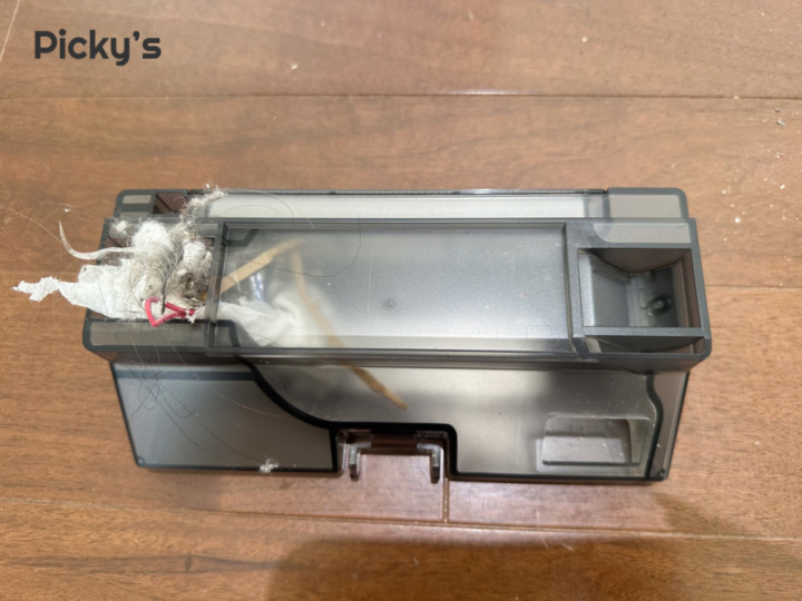 とはいえ、実際にダストボックスを確認すると大きめのゴミも回収できており、複数回走行させることで徐々に吸い込めている様子も見られました。1回の走行で完璧に取り切るというより、繰り返し清掃することで仕上がっていくタイプの吸引性能といえそうです。
