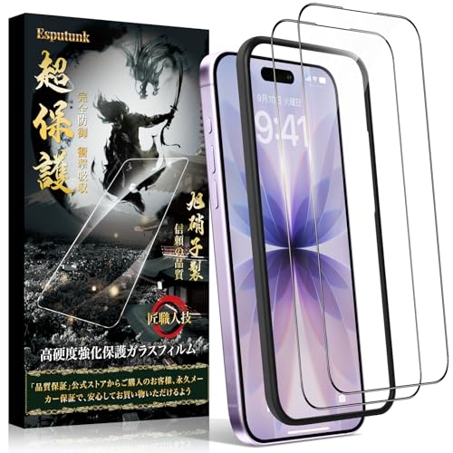 iPhone16Pro用の6.1インチガラスフィルム2枚とカメラ保護フィルム2枚のセットです。硬度9Hで衝撃を緩和し、画面の破損を最低限に抑えます。飛散防止設計なので万が一割れてしまってもガラスが飛び散らず安全です。