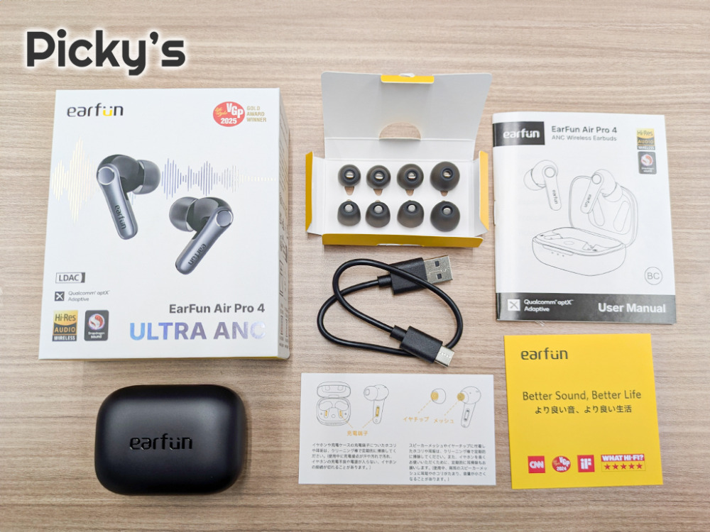 EarFun Air Pro 4は、1万円以下で購入できる高コスパの完全ワイヤレスイヤホンです。VGP 2024金賞を受賞し、Qualcommの最先端チップQCC3091を搭載しています。