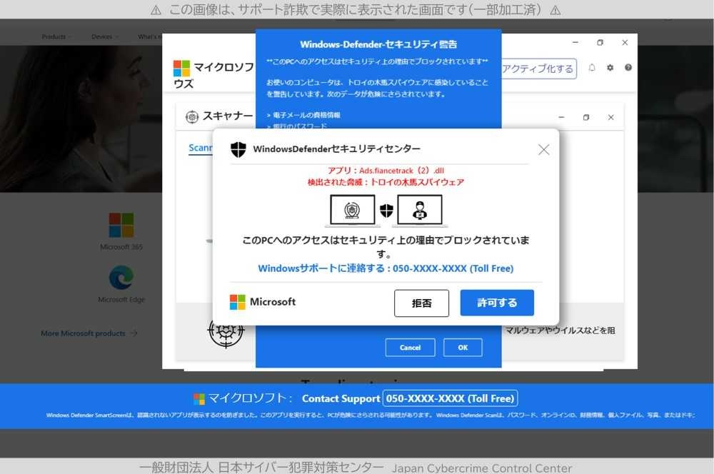 詐欺サポートセンターへの電話や、不正なウイルス対策ソフトを購入させるリンクが含まれている。