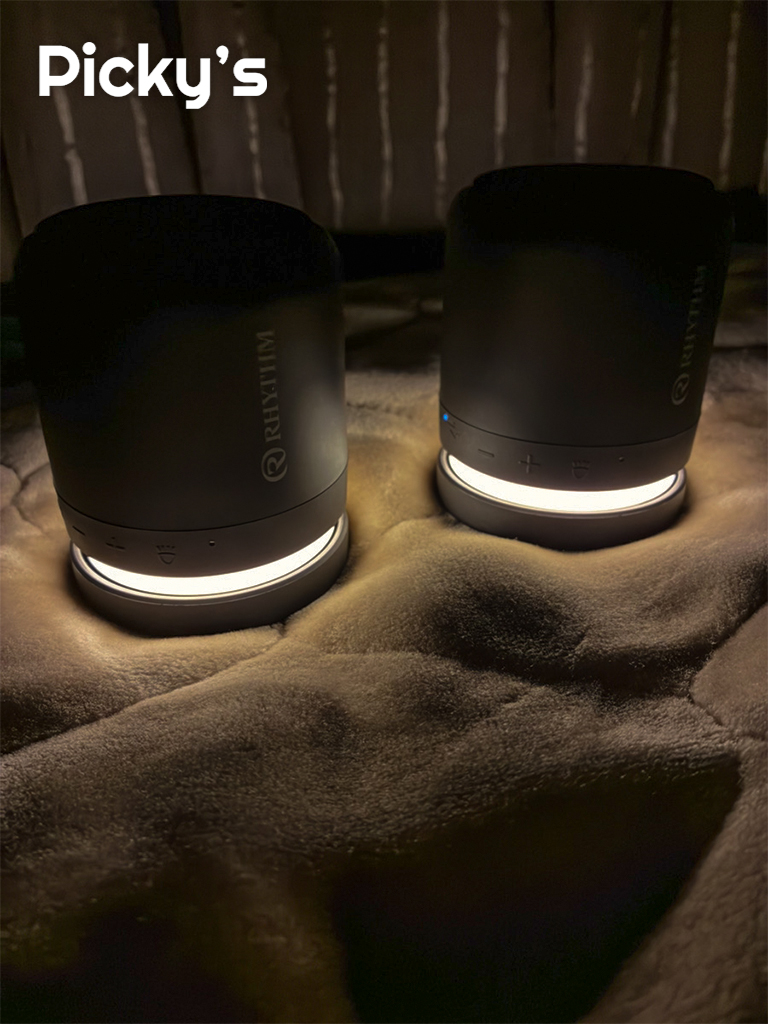 音楽に合わせてライトが光り、想像以上に場が盛り上がりました。立体感のあるサウンドも好印象です。底面は滑りにくく安定感があり、マグネット&防水仕様で冷蔵庫や浴室でも使え、デザイン性と実用性を両立したスピーカーだと感じました。